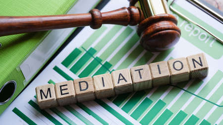 Word mediation with judge gavel. Conflict and dispute resolve concept