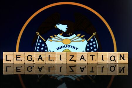 WROCLAW, POLAND - FEBRUARY 04, 2020: Utah State Flag and word LEGALIZATION made of small wooden letters. Drug policy. Legalization of marijuana.