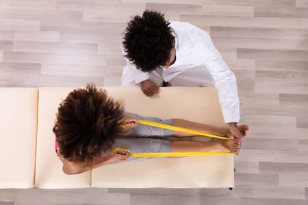 Injured patient lying on a physiotherapy bed and performing exercises with tapes under the care of a doctor