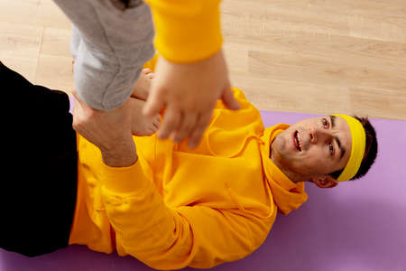 Young man with little boy doing fitness exercises at home. Father and son having fun during sport. Dad and his child making training. Sport, yoga. Workout in the apartment. Healthy lifestyle, family.