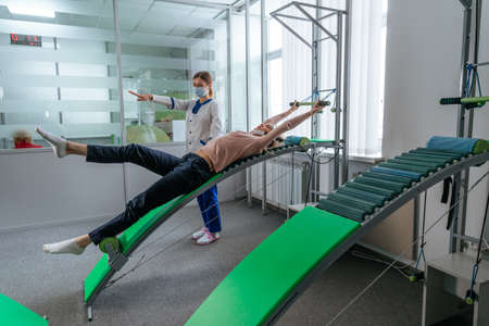 Female doctor rehabilitologist working with female patient on the special rehabilitation device