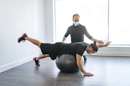 Couple during rehabilitation therapy at the clinic. Man doing a full-body workout with the medical bar and resistance bands.
