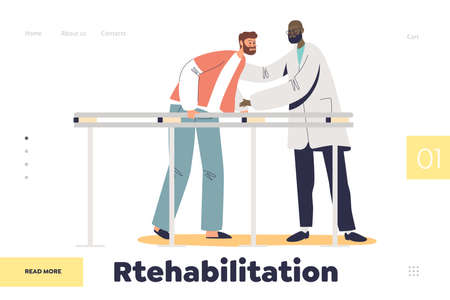 Rehabilitation concept of landing page with doctor helping patient to walk after injury