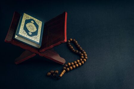 Holy Al Quran with written arabic calligraphy meaning of Al Quran and tasbih or rosary beads on black background. Selective focus and crop fragment