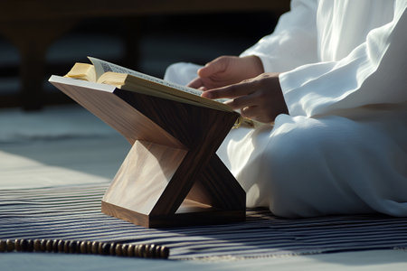 An Arab adult man reading the Quran from a wooden stand in a peaceful, serene setting.