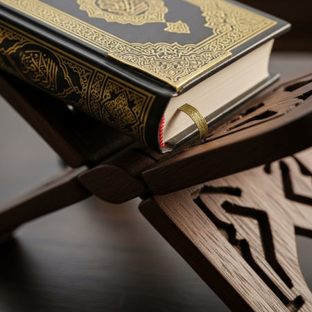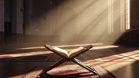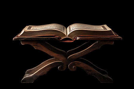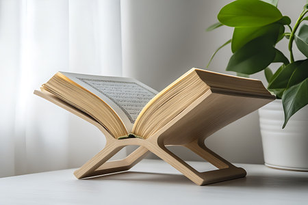 A beautifully arranged scene featuring an open Islamic holy book resting on a intricately carved wooden stand. Beside it, a classic decorative lantern with a golden finish and a potted green plant add to the serene atmosphere. This image evokes a sense of reverence and religious devotion, perfect for reflecting on spiritual themes.