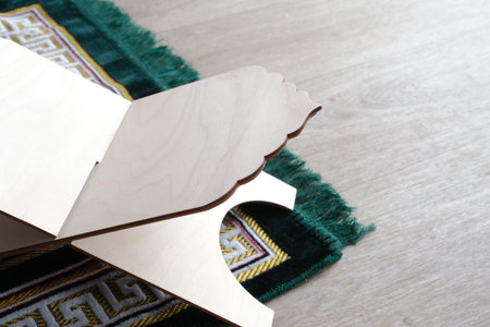 peaceful minimalist prayer space with prayer rug and wooden book stand in the room