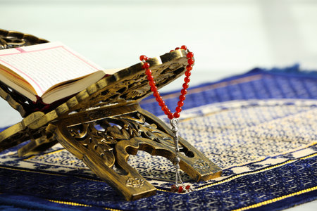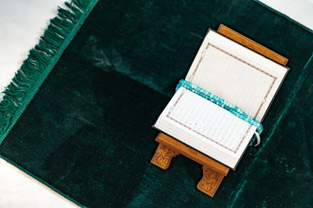 Rehal with open Quran and prayer beads on Muslim prayer mat. Space for text