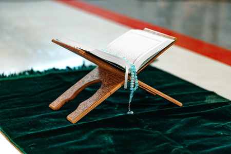 Rehal with open Quran and Misbaha on Muslim prayer rug, closeup