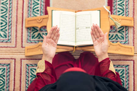 Muslim woman praying for Allah muslim god at the mosque. Hands of muslim woman on the carpet praying in traditional wearing clothes, Woman in Hijab.