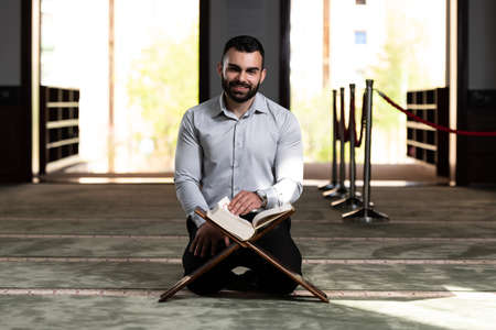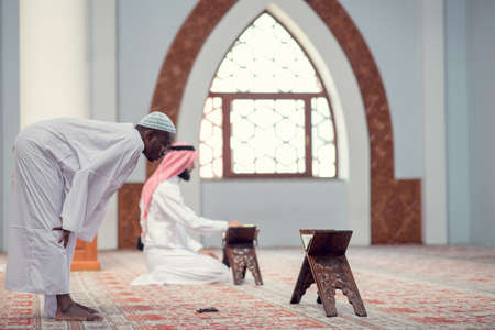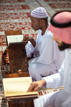 A group of Muslims reading the holy book of the Quran in a modern mosque during the Muslim holiday of Ramadan