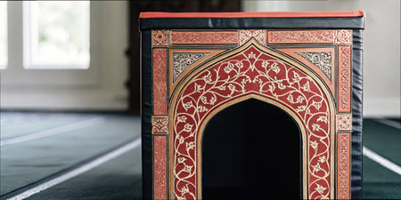 Ornate quran stand in mosque with intricate red and gold embroidery design