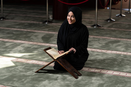 Beautiful Muslim Woman in Hijab Dress Sitting in Mosque and Praying With Quran