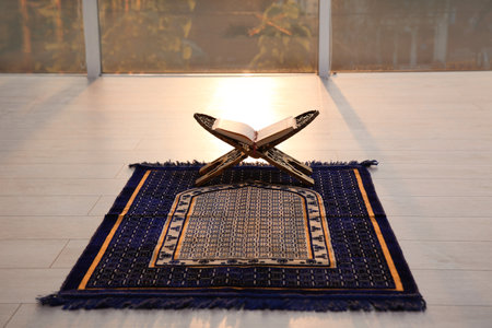 An open book sits casually atop a rug, showcasing its pages and inviting engagement, A Quran opened on a prayer rug, AI Generated