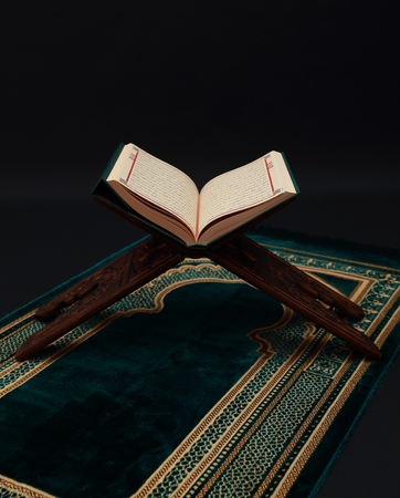 Islamic Holy Book Quran on wood carving rahle with rosary beads and prayer rug on black background. Kuran the holy book of Muslims. Ramadan concept.