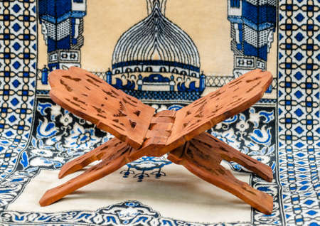 Quran in the mosque - open for prayers The black background of the Muslims around the world placed on a wooden board Quran in the mosque - open for prayers
