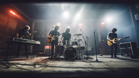 Immerse yourself in the electrifying world of live rock music as a dynamic three-piece band ignites the stage in an old warehouse, their music creating a captivating motion blur atmosphere.