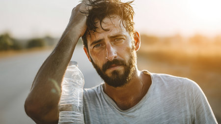 A weary man stands on the roadside, holding a water bottle and wiping his sweat. His expression reflects a blend of focus and determination under the warm glow of sunset.