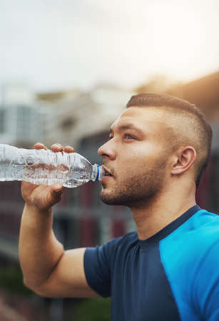 Running made me hot, the water is cooling me down. a handsome young male runner taking a break and drinking water outdoors.