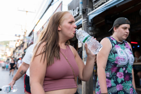 Thailand, Phuket, April 15, 2020: heat, a female tourist drinks water from a plastic bottle on the street outside