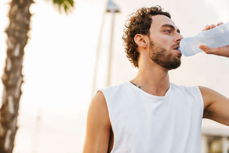 Young sportsman person drinking a bottle of fresh water to cool off after a hard workout outdoors on a hot sunny day at sunset