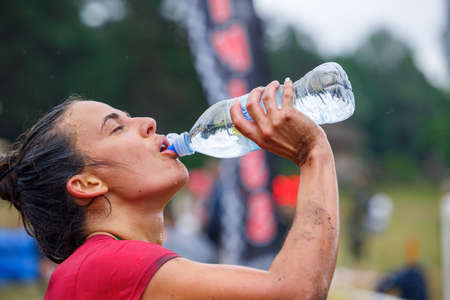 Resting young caucasian woman drinks water from plastic bottle after hard workout closeup. Thirst, heat, energy restore and water balance in the body.