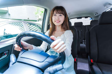 Asian young Woman behind the wheel of a car.