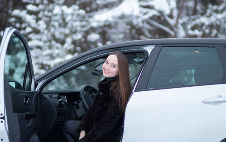 A girl driving a car in winter. Winter car driving by a woman