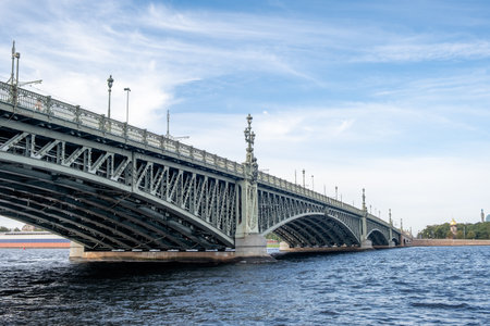 View of historic metal drawbridge Troitsky across Neva River, Saint Petersburg, Russia