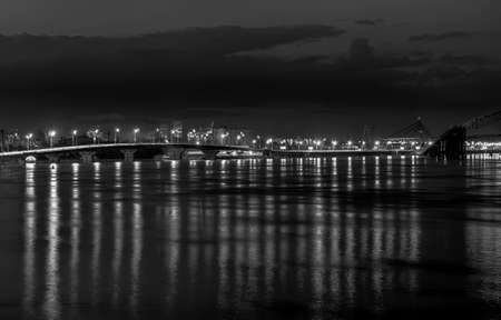 Lights night city and bridge with reflections on the river black and white
