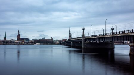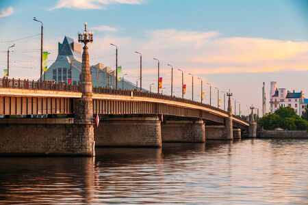 April 24, 2018 Riga, Latvia. View of the Old Town and the automobile bridge over the Daugava in Riga.