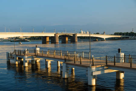 Urban landscape and a beautiful sunset in the evening on the river embankment with a bridge. Copy space