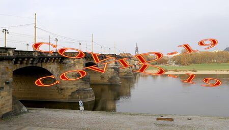 Coronavirus in Dresden, Germany. View of bridge over Elbe river. Covid-19 sign. Concept of COVID pandemic and travel in Europe.