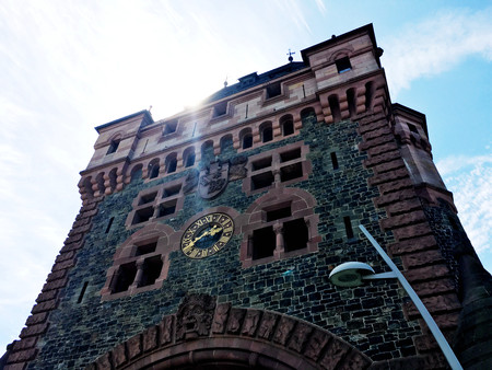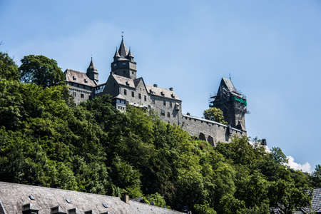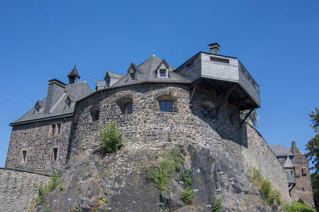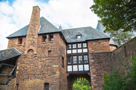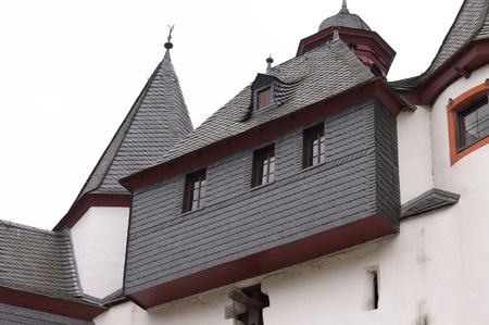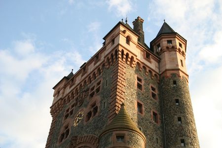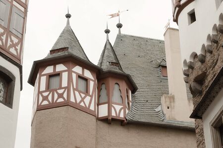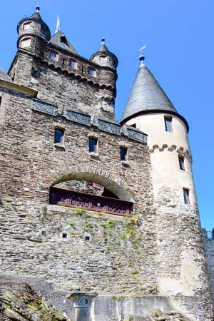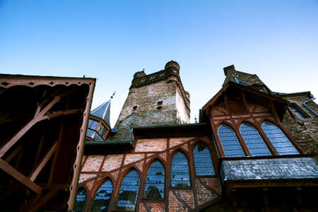 fragment of architecture of castle in Cochem, Germany, over blue sky