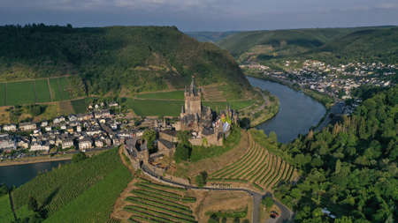Aerial view of Cochem Castle on the hill near river surrounded by green vineyards, trees, fields, small houses, bridge. German flag waving on the top of tower. Summer. Germany historical landmarks.