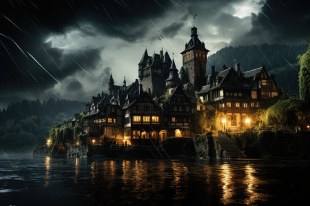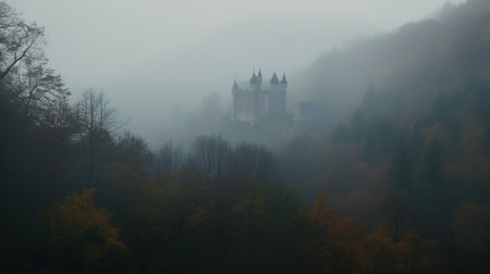 In the twilight, a grand castle stands out with its warm lights against a backdrop of rolling fog. The surrounding forest adds to the mystical atmosphere, enhancing the enchantment of the scene.