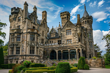 A large castle-like building with impressive turrets stands behind a garden in the foreground, A historic castle with turrets and grand stone facades