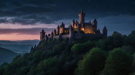 A majestic castle sits atop a hill, illuminated at twilight, beneath a starry sky. The castle is surrounded by a forest, with mountains in the distance. The scene conveys a fairytale or fantasy atmosphere.