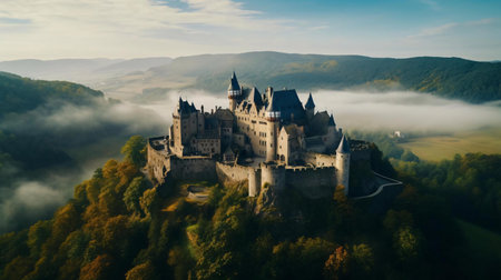 Majestic medieval castle surrounded by lush greenery, captured from above