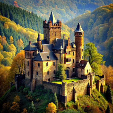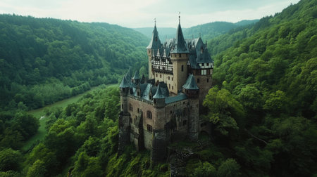 The medieval Eltz Castle in Germany, nestled in a forested valley, standing alone without any signs of human presence