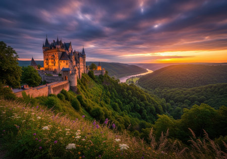 A medieval castle on a hilltop with a scenic landscape and sky