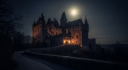 A mysterious castle stands silhouetted against a dark night sky, illuminated by a bright full moon. Warm light emanates from windows, hinting at life within.