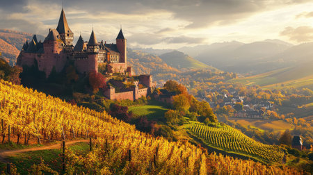 Château du Haut-Koenigsbourg stands majestically atop a hill, surrounded by colorful autumn vineyards and rolling hills, showing its historical charm in Grand Est.