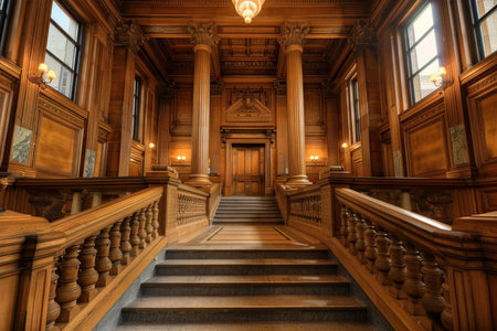 Empty grand staircase with wooden banisters leads to a large wooden door at the top of the stairs in a historic courthouse