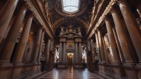 Grand Classical Interior with Ornate Ceiling and Sunlit Arches