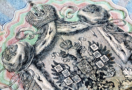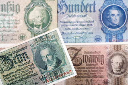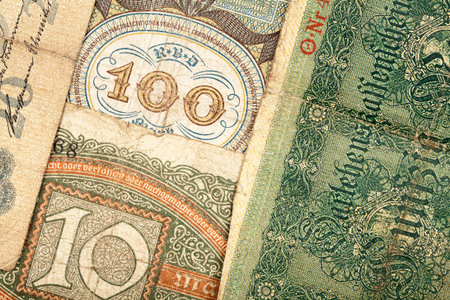 Part of an old German banknote from 1910. Other old banknotes can be seen blurred in the background.