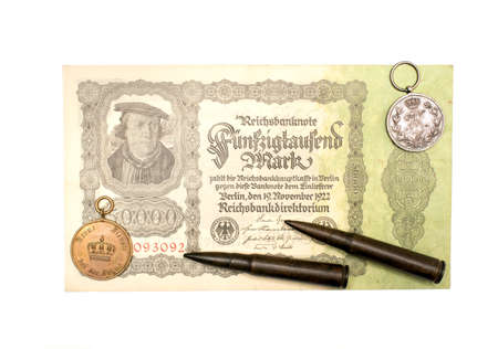Bitcoin with old german money. Inflation 1923, one million marks. Cryptocurrency concept background. Closeup, copy space.