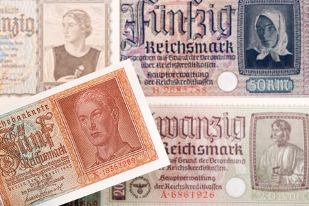 50 Reich marks bills lies in different order isolated on white. Local banking or money making concept. Business background banner