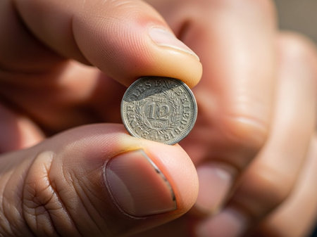 Persons hand holding out a dime coin or ten cents, the Currency of the Canada - on a brown background. Money exchange.