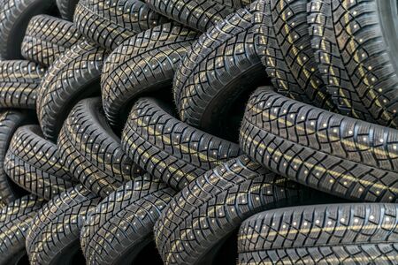 A bunch of old tires from used cars. Environmental pollution. Dump tires